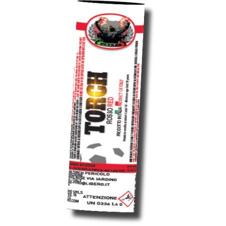 Torcia da stadio rossa italiana Accensione: a sfregamento Durata: 60 secondi circa Dimensioni: Altezza 210 mm - Diam. 30 mm CAT EU: P1 --- CAT ITA: VD
